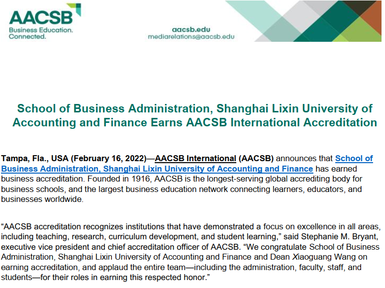 AACSB 执行副总裁兼首席认证官Stephanie M. Bryant在来函中表示:“AACSB认证认可在教学、研究、课程开发和学生学习等所有领域都表现出卓越的机构。上海立信会计金融学院工商管理学院对获得认证的承诺真实反映了他们的奉献精神——不仅是对他们的学生、校友和众多商业伙伴,而且对整个高等教育行业”,这标志着工商管理学院在行政管理、人才培养、科学研究和社会服务和等方面的工作获得国际商学教育最权威认证机构的认可,是工商管理学院在国际化进程中的重大突破,也将为教师、学生和校友们提供更高层次的国际合作与交流平台。