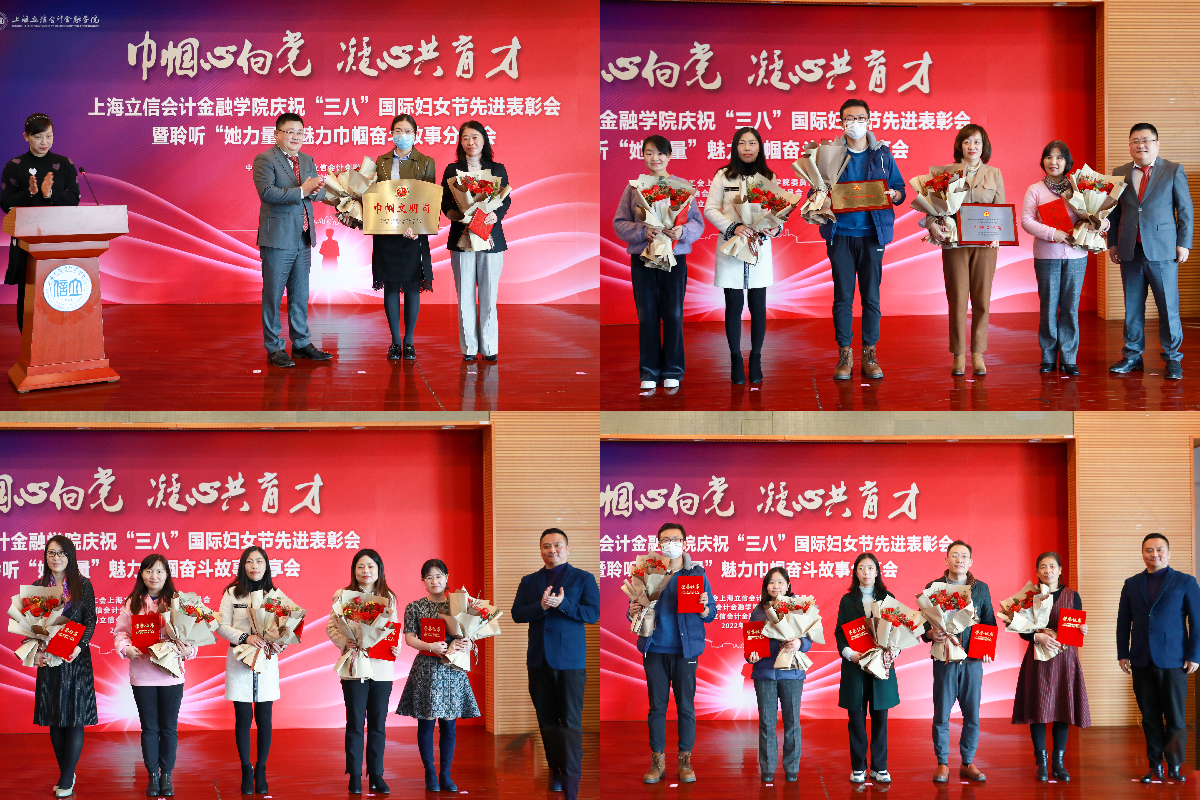 会上,校工会常委、女工委副主任王婧宣读表彰名单。文选才为荣获上海市三八红旗手、上海市及教育系统巾帼文明岗、上海市教育系统三八红旗手(集体)、上海市教育系统最美家庭和比翼双飞模范佳侣提名奖的获奖个人和集体颁奖。校工会常务副主席孙翼为荣获上海立信会计金融学院三八红旗手(集体)颁奖。