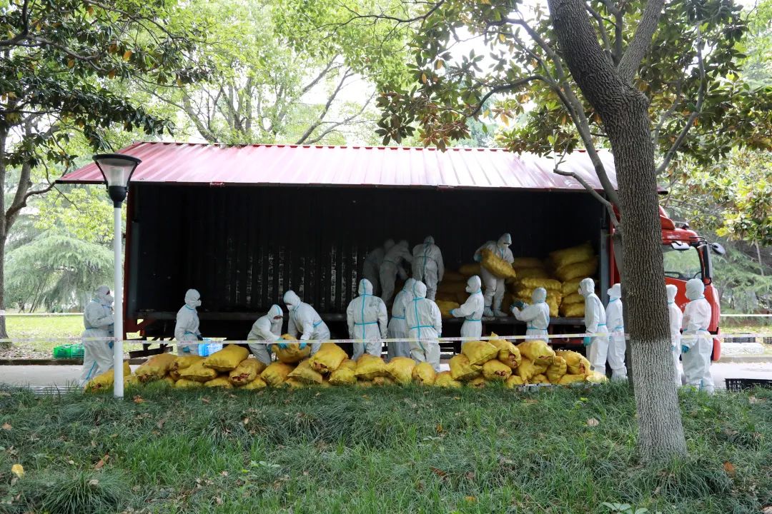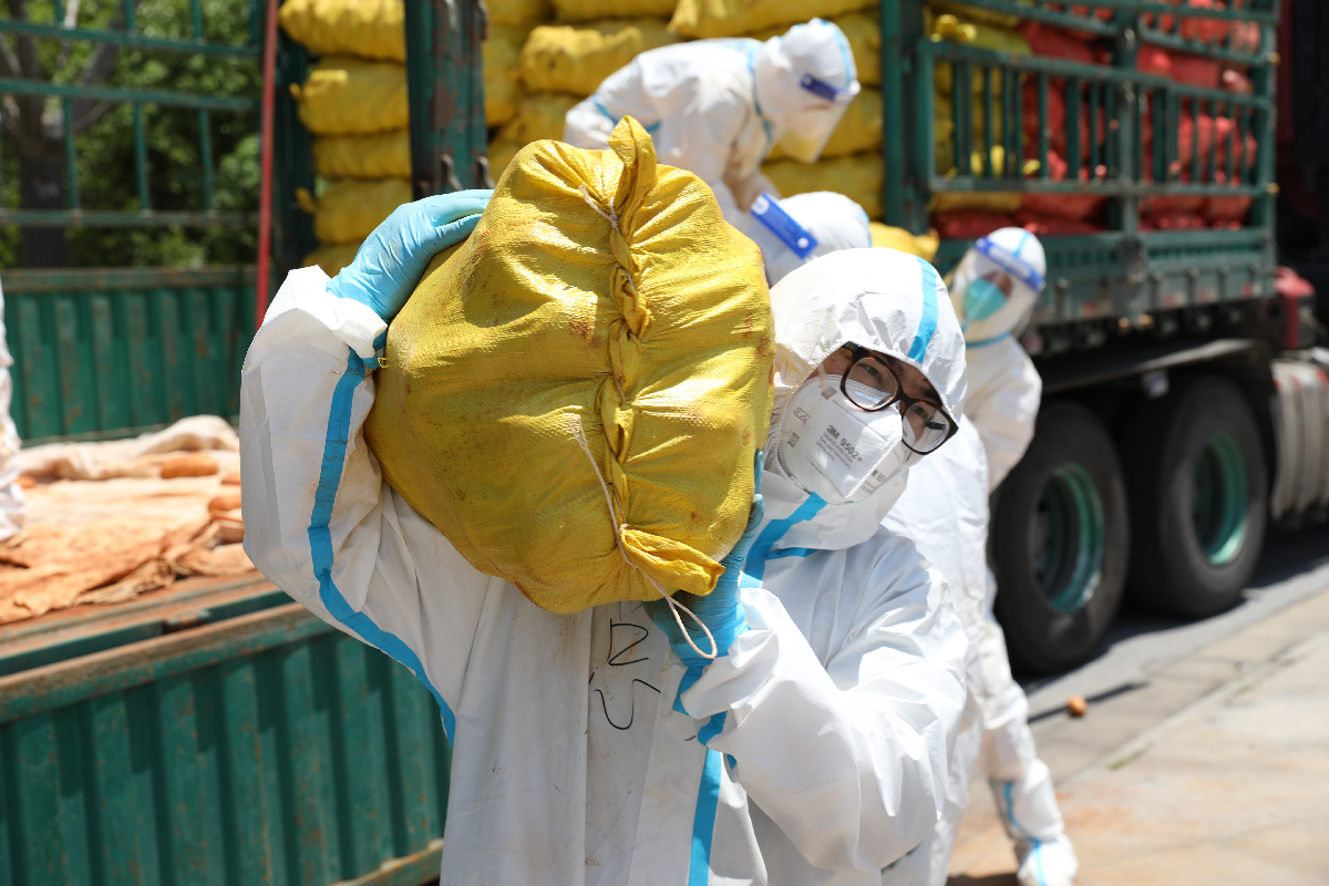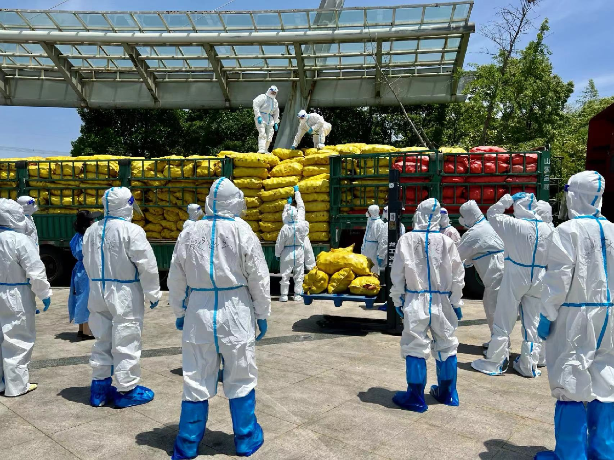 两辆满载蔬菜的卡车抵达学校后,学校青年干部、教师,保卫处、总务处工作人员、学生志愿者等齐上阵,在严格操作流程和消杀防护下承担起了卸货搬运工作。大家在烈日下苦战7小时,个个大汗淋漓。大家纷纷表示:为了早日战胜疫情,再苦再累也值得!