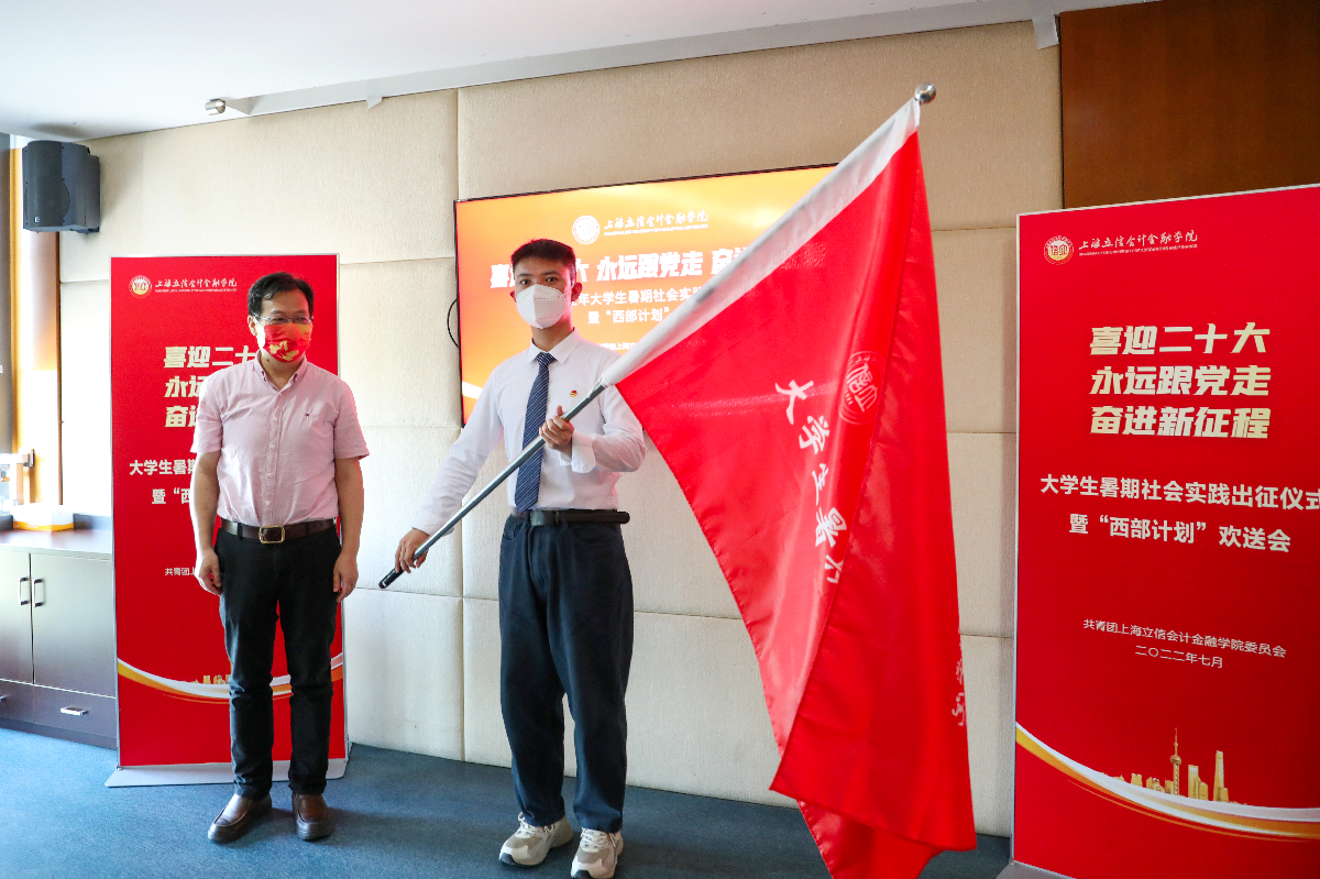 会上,王军华代表学校向社会实践团队代表授总旗。相关职能部门领导向“助力乡村振兴,建设美丽中国”专项社会实践团队代表授旗,为即将出征的西部计划志愿者代表授予绶带、佩戴红花并颁发荣誉证书、纪念品,宣读了《关于2022年上海立信会计金融学院大学生暑期社会实践活动立项的通知》和《关于2022-2023年度上海市大学生志愿服务西部计划复试选拔结果的通知》。