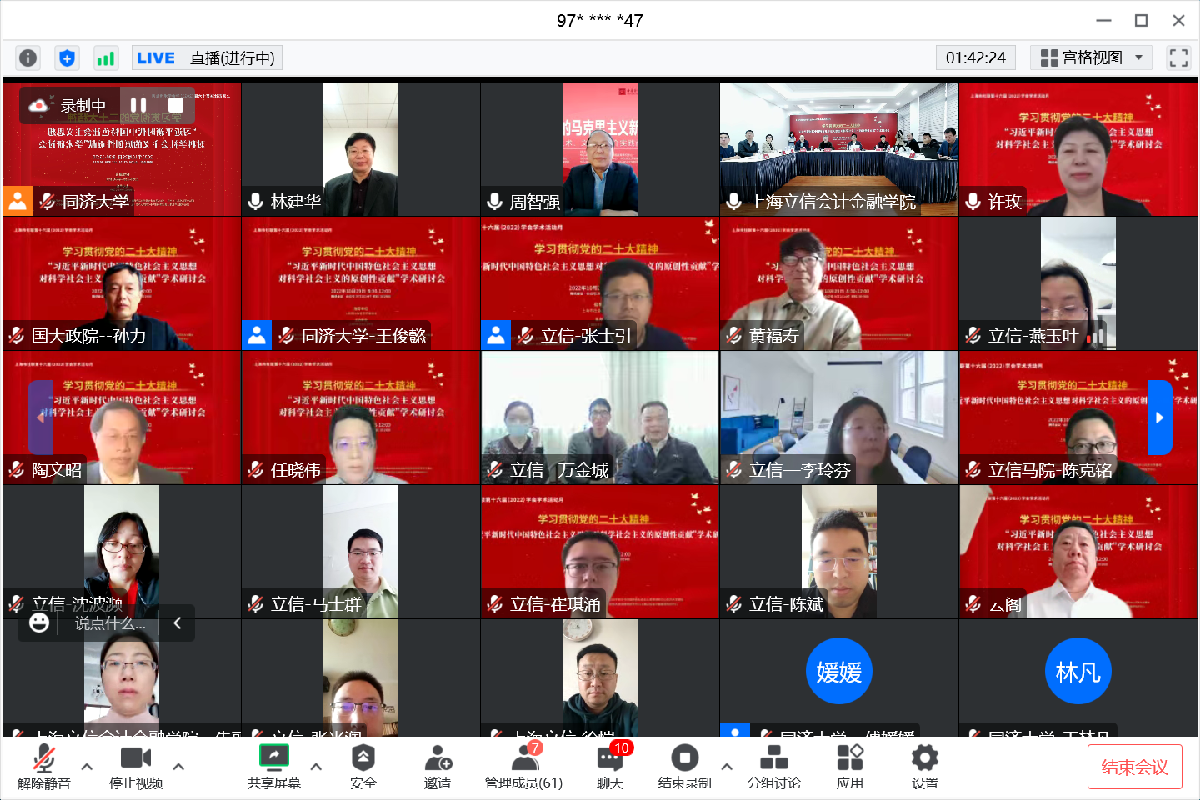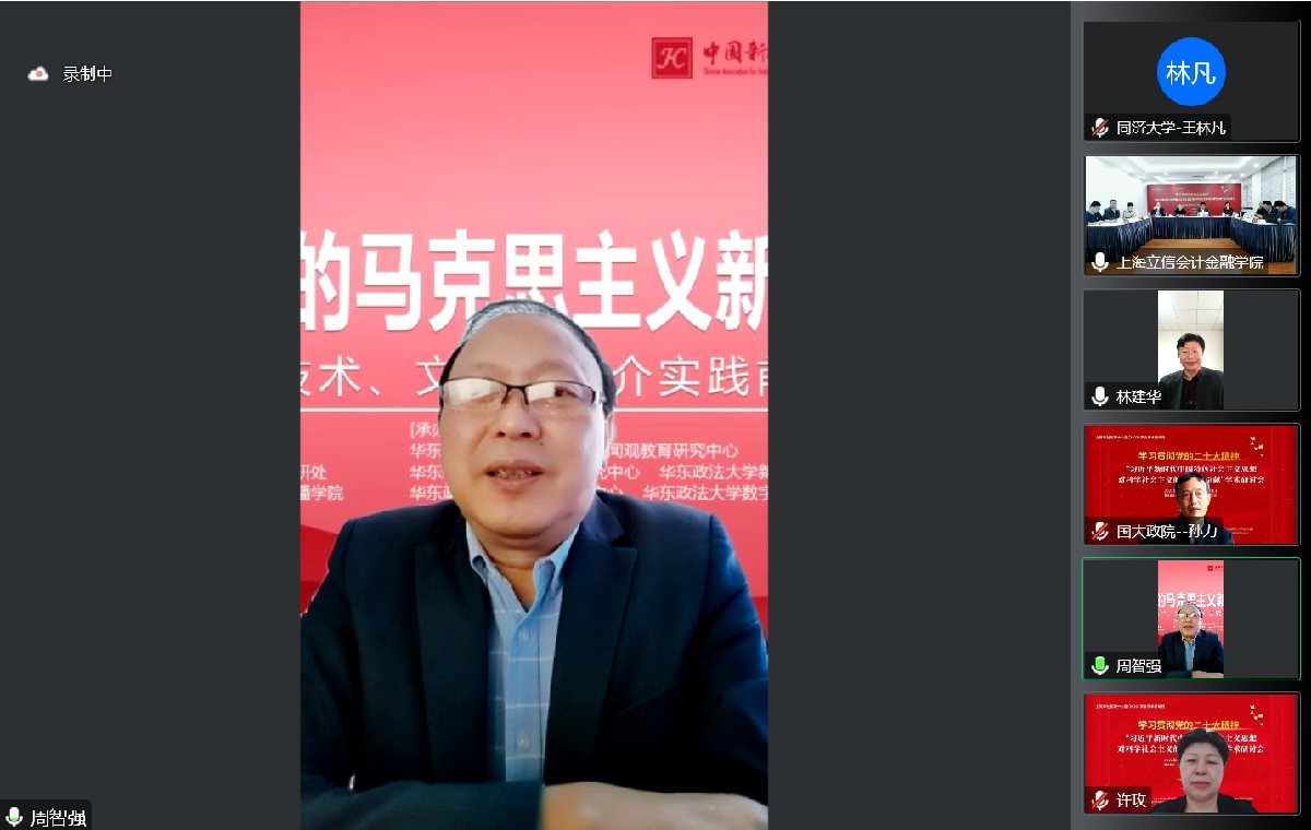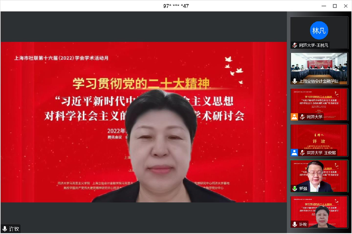 为深入学习贯彻中国共产党第二十次全国代表大会精神,10月29日,“习近平新时代中国特色社会主义思想对科学社会主义的原创性贡献”学术研讨会在我校举行。研讨会由上海科学社会主义学会主办,同济大学马克思主义学院、上海立信会计金融学院马克思主义学院、上海市习近平新时代中国特色社会主义思想研究中心同济大学基地、高校中国共产党伟大建党精神研究中心同济大学分中心、高校中国共产党伟大建党精神研究中心上海立信会计金融学院分中心联合承办。中共中央党校(国家行政学院)、中国社会科学院、中国人民大学、山东大学、国防大学、同济大学、我校等国内数十所科研单位、高校的200余名专家学者在线上线下参加了研讨会。